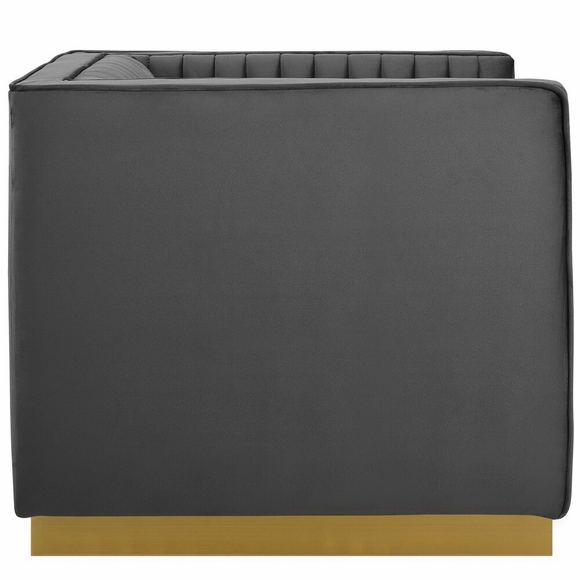 Glamour radiates from the organic linear design of the Sanguine Performance Velvet Armchair. Relax and follow the interior vertical channel tufting for a streamlined effect that adds retro modern glamour to your living room, entryway, lounge room, or home office. Soft, stain-resistant performance velvet upholstery creates a luxurious tactile experience while dense foam padding with individually wrapped spring coil system provides ultimate comfort and support. Sanguine's palatial accents and premium comfort rest securely on a gold stainless steel base that complements any contemporary modern home or apartment. Maximum weight capacity: 300 lbs.
