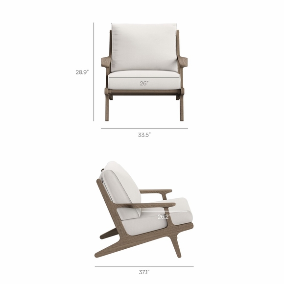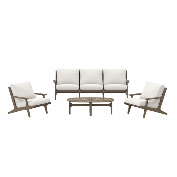 Refresh your outdoor space with the Saratoga 4-Piece Patio Furniture Set. Expertly crafted from durable teak wood with a water-based finish that highlights its natural grain, this backyard furniture set includes a sofa, two lounge chairs, and a coffee table. The sofa and lounge chairs feature an angular frame with sculpted armrests, slatted seat foundations, and plush seat and back cushions covered in weather-resistant, water-resistant, and stain-resistant fabric for easy maintenance and year-round relaxation. The coffee table boasts a beautifully slatted top with an intersecting stretcher base, offering both durability and a refined silhouette. Perfect for patios, porches, and outdoor lounge areas, the Saratoga 4 Piece Patio Set blends modern design with timeless craftsmanship. Assembly required.