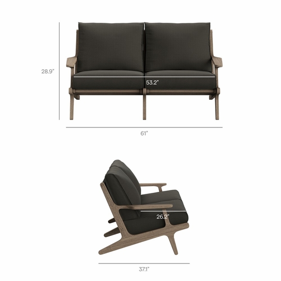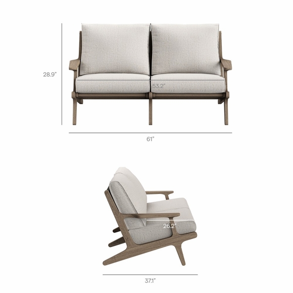 Refresh your outdoor space with the Saratoga Patio Loveseat. Expertly crafted from durable teak wood with a water-based finish that highlights its natural grain, this two-seater outdoor couch features an angular frame with sculpted armrests and a slatted seat foundation for lasting support. Designed for comfort and durability, the plush seat and back cushions are covered in weather-resistant, water-repellent, and stain-resistant fabric, allowing for easy maintenance and year-round relaxation. Perfect for patios, porches, and outdoor lounge areas, the Saratoga Teak Patio Loveseat blends modern design with timeless craftsmanship. Assembly required. Weight Capacity: 500 lbs.