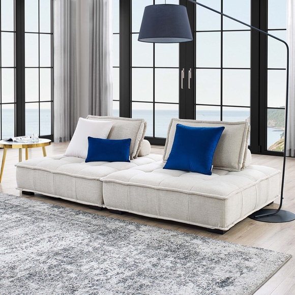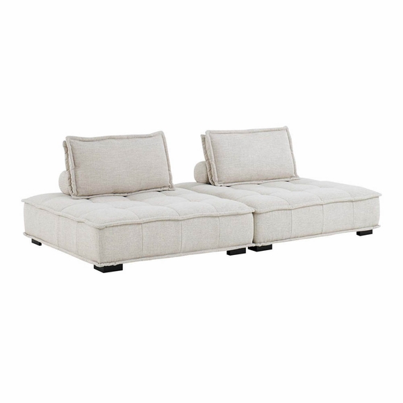 Sprawl out amidst comfort and style on the Saunter Tufted Fabric 2-Piece Loveseat. with square biscuit tufting, French piping detail, and soft polyester upholstery, this sectional sofa collection brings tailored style to your living space or lounge area with its charming low profile silhouette. A removable bolster pillow supporting a seat back cushion offers a comfortable place to rest while watching TV, relaxing, or entertaining. Dense foam padding and a sinuous spring support system grant a premium seating experience for all occasions. This two-piece loveseat rests atop L-shaped rubberwood legs with non-marking foot caps. Set Includes: 2 Armless Chairs; Weight Capacity Each Chair: 300 lbs.