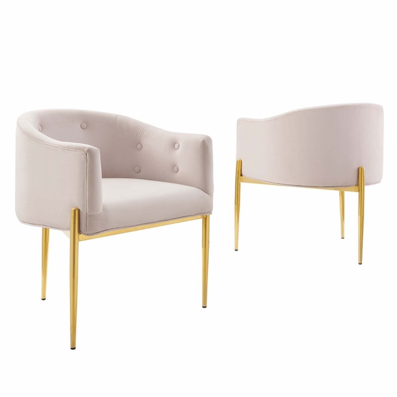 Bring luxe elegance to your living space or dining room with the Savour Tufted Performance Velvet Accent Armchairs. Featuring a sweeping silhouette and updated club chair design, this velvet chair set of two is suited for the dining table or living room, entryway, bedroom, or office as an accent chair. These accent chairs are upholstered in stain-resistant performance velvet upholstery and feature dense foam padding to offer a comfortable seat while dining, working, reading, or relaxing. Resting on chrome gold stainless steel legs, this versatile accent chair set has interior button tufting and a charming curved shape. Chair Weight Capacity: 300 lbs.