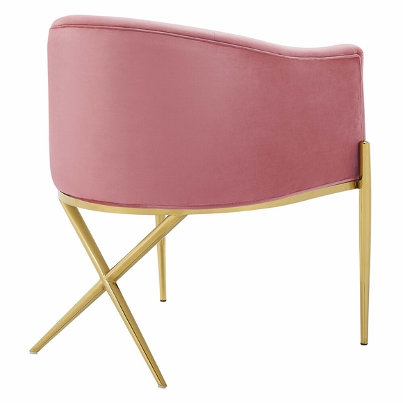 Bring luxe elegance to your dining room or living space with the Savour Tufted Performance Velvet Accent Dining Armchair. Featuring a sweeping silhouette and updated club chair design, this velvet chair is suited for the dining table or living room, entryway, bedroom, or office as an accent chair. This dining chair is upholstered in stain-resistant performance velvet upholstery and features dense foam padding to offer a comfortable seat while dining, working, reading, or relaxing. Resting on a chrome gold tubular stainless steel frame, this versatile accent chair has interior button tufting and a charming curved shape. Chair Weight Capacity: 300 lbs.