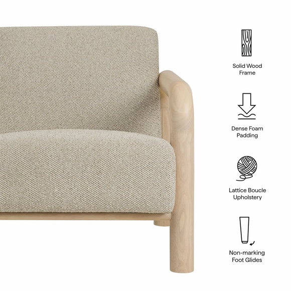 The Sereno Accent Chair brings sculptural elegance and elevated texture to any modern space. Wrapped in a soft lattice-style boucle fabric, this lounge chair features a refined grid weave that updates the classic boucle with a sophisticated twist. Its standout feature is the pair of oversized, rounded armrests crafted from solid rubberwood-bold in silhouette, smooth to the touch, and rich in natural character. With a generously padded seat and supportive backrest filled with dense foam, Sereno offers plush comfort in a compact footprint. Perfect for reading corners, bedroom nooks, or cozy lounge setups, this upholstered armchair combines modern style with everyday comfort. Non-marking foot glides protect floors, and this fabric accent chair arrives fully assembled. Weight Capacity: 300 lbs.