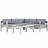 Enjoy your patio or backyard leisure time with the strong and durable Shore Outdoor Patio Collection. Made of anodized brushed aluminum frames and non-marking black plastic foot caps, Shore Outdoor Sectional Sofa pieces come outfitted with resilient fabric canvas tested to last through all weather conditions. The Shore Outdoor Patio Sectional Furniture Set complements casual gatherings with a chic look and ready versatility you can rely on.