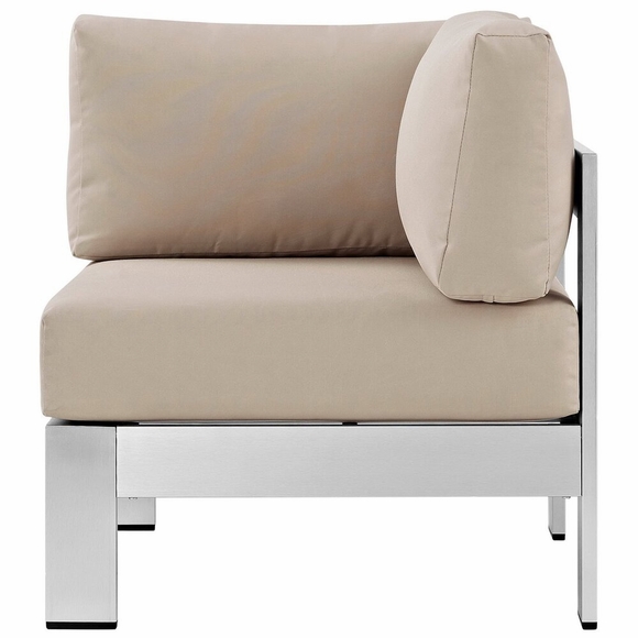 Enjoy your patio or backyard leisure time with the strong and durable Shore Outdoor Patio Corner Arm Chair. Made with an anodized brushed aluminum frame and non-marking black plastic foot caps, this outdoor deck chair comes outfitted with resilient fabric canvas tested to last through all weather conditions. The Shore Outdoor Corner Armchair complements your casual gatherings with a look and functionality you can rely on.