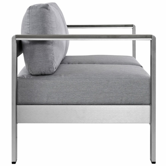 Enjoy your patio or backyard leisure time with the strong and durable Shore Outdoor Patio Loveseat. Made with an anodized brushed aluminum frame and non-marking black plastic foot caps, Shore Patio Loveseat comes outfitted with resilient fabric canvas tested to last through all weather conditions. The Shore Outdoor Loveseat complements your casual gatherings with a look and functionality you can rely on.