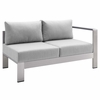 Enjoy your patio or backyard leisure time with the strong and durable Shore Outdoor Aluminum Right-Arm Loveseat. Made with an anodized brushed aluminum frame and non-marking black plastic foot caps, Shore comes outfitted with resilient Sunbrella® fabric canvas cushions tested to last through all weather conditions. The Shore Outdoor Aluminum Right-Arm Corner Sectional Loveseat complements your casual gatherings with a look and functionality you can rely on.