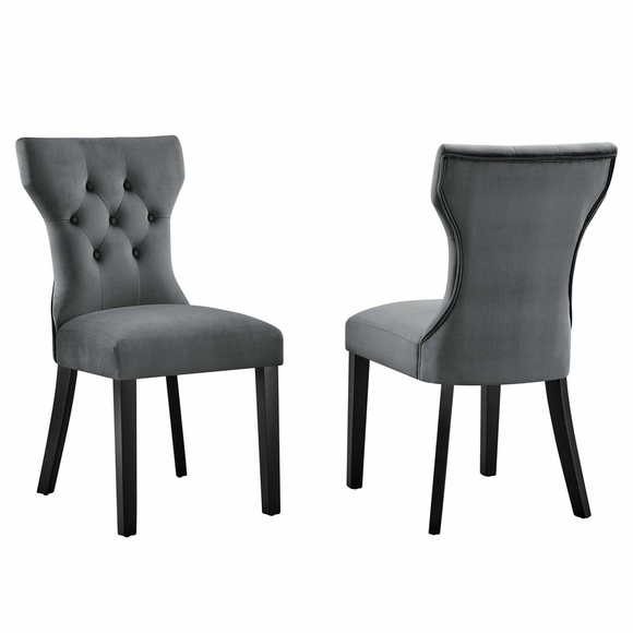 Graceful curves whisper elegance from every position on the Silhouette Dining Chairs - Set of 2. A softly tapered back and rounded hardwood legs lend distinguished support to this hourglass-shaped chair upholstered in stain-resistant performance velvet fabric. Dense foam padding and a sinuous spring support system grant a premium seating experience. Invite your way into the lap of luxury at every gathering.