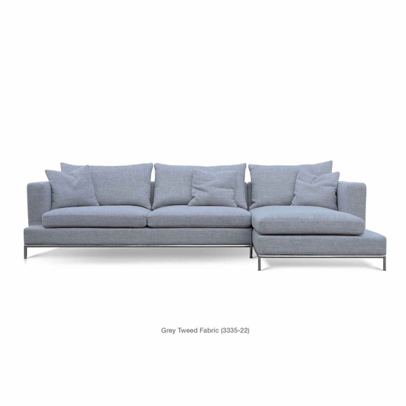 Simena Sectional is a contemporary relaxing sectional sofa with very comfortable cushions and frame on continuous tubular metal base which has cylindrical chromed steel legs tipped with plastic glides. The sofa has solid hardwood frame. The loose removable cushions are zippered and filled with down and feather. The frame is upholstered with velcro enclosed slip cover. Simena Sectional can now be special ordered with no minimum quantity required. The sofa is suitable for both residential and commercial use.