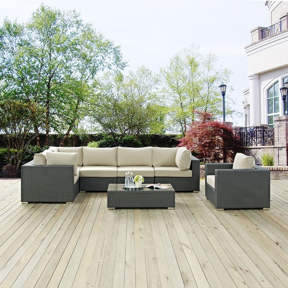 Set Includes: One - Sojourn Rattan Outdoor Patio ArmchairTwo - Sojourn Rattan Outdoor Patio Armless ChairsOne - Sojourn Rattan Outdoor Patio Coffee TableThree - Sojourn Rattan Outdoor Patio Corners