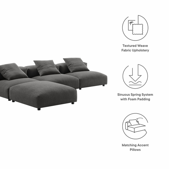 Revel in ultimate comfort and modern style with the Solace Modular Sectional Sofa. This oversized fabric sectional sofa is perfect for any living room, offering endless flexibility. Its modular furniture design allows you to change the arrangement to suit the needs of the moment or expand your seating by adding more pieces in the future. Featuring a sturdy frame, dense foam padding, and a sinuous spring support system, the the Solace 3 Seater Couch grants a premium seating experience with it's soft textured woven fabric upholstery. The comfy upholstery adds a cozy, casual vibe, making this deep seat sofa a perfect addition to any living space or lounge area. Equipped with non-marking plastic glides and complementing accent pillows, this 4-piece sectional sofa set is both stylish and practical. With no assembly required, you can enjoy immediate relaxation with this L-shaped modular sectional sofa. Set Includes: 3 Armless Chairs, 1 Ottoman
