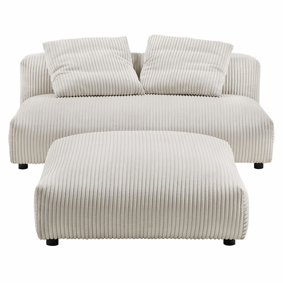 Revel in ultimate comfort and modern style with the Solace Modular Corduroy Armless Loveseat and Ottoman Set. This oversized corduroy armless loveseat with a matching ottoman is perfect for any living room, offering endless flexibility. Its modular furniture design allows you to change the arrangement to suit the needs of the moment or expand your seating by adding more pieces in the future. Featuring a sturdy frame, dense foam padding, and a sinuous spring support system, the Solace Small Sofa Couch grants a premium seating experience. The comfy corduroy upholstery adds a cozy, casual vibe, making this armless two-seater sofa a perfect addition to any living space or lounge area. Equipped with non-marking plastic glides and complementing accent pillows, this loveseat sectional is both stylish and practical. With no assembly required, you can enjoy immediate relaxation with this loveseat sofa with ottoman set. Loveseat Weight Capacity: 800 lbs., Ottoman Weight Capacity: 500 lbs.