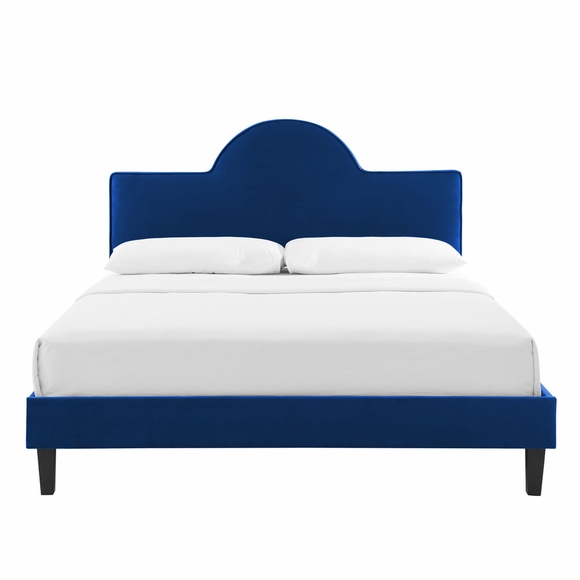 Awaken a teenager's bedroom or guest bedroom with the energizing style of the Soleil Performance Velvet Full. Offering luxe texture and a glam deco look, the full headboard of this bed features an arching silhouette reminiscent of the morning sunrise. This full size bed is upholstered in stain-resistant performance velvet and padded with dense foam creating a soft, supportive place to rest and relax while sitting up in bed. Eliminating the need for a box spring, the MDF frame of this full bed is complete with a wood slat support system crafted with poplar for lasting durability and support. A sturdy mattress foundation for memory foam, innerspring, latex, and hybrid mattresses, this slatted bed frame rests atop tapered black wood legs and includes a reinforced center beam with two support legs for enhanced stability. Full Bed Weight Capacity: 800 lbs.