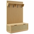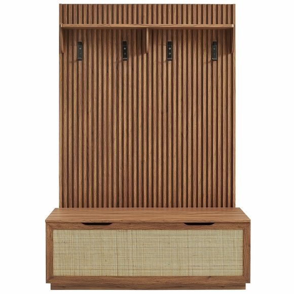 A complete entryway solution, the Soma Fluted Hall Tree with Rattan Storage Bench combines natural texture, functional design, and a streamlined silhouette. This two-piece entryway storage set features a vertical slatted coat rack with four sturdy hooks and a top display shelf, anchored by a coordinating storage bench. Crafted with a warm wood grain finish and faux rattan panels, the Soma entryway bench with storage adds an organic touch to modern, transitional, or Scandinavian-inspired interiors. This rattan bench opens with two cut-out handles and a flip-top hinge, revealing a divided interior with deep compartments for shoes, blankets, or everyday items. Soft-close hinges provide ease of use, while a flat base offers a solid, grounded profile. On top, the fluted hall tree panel provides ample space to hang coats, bags, and accessories, with wall-mount brackets granting secure installation. Together, this hall tree with rattan bench and shoe storage offers a stylish 3-in-1 entryway storage solution-perfect for mudrooms, hallways, or foyers. Assembly required. Bench Weight Capacity: 209 lbs.