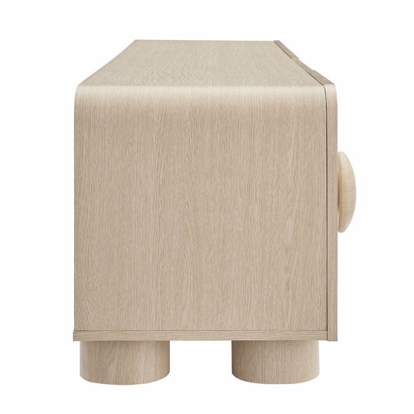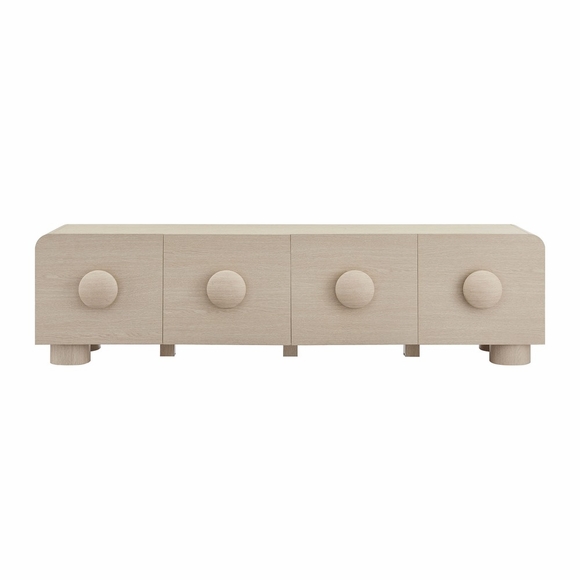 Experience the timeless appeal of the Sonnet Retro Low TV Stand that combines modern design with practical functionality. This 69" TV stand features rounded corners and circular handle pulls that resemble giant buttons, adding a whimsical touch to its sleek aesthetic. Constructed with a durable blend of materials and finished with a wood grain paper laminate, this retro TV stand is both stylish and sturdy. Perfect as a home entertainment center, Sonnet boasts four spacious drawers that provide ample storage for media essentials, gaming consoles, home accessories, and more. Versatile in use, Sonnet can accommodate wall-mounted TVs up to 76 inches, making it an ideal modern media console for your living room, office, or entertainment space. Resting on simple legs with non-marking foot glides, this low profile TV stand with drawers requires assembly. Weight Capacity: 220 lbs.