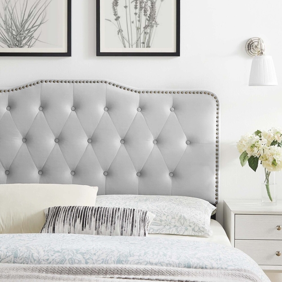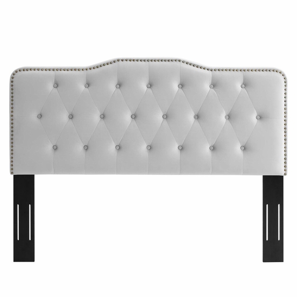 Refresh your master bedroom or guest bedroom with the glam deco style and vintage modernity of the Sophia Tufted Performance Velvet King/California King Headboard. Adorned with classic button tufting and framed with nailhead trim, this king/Cali king size headboard features a charming silhouette. Upholstered in stain-resistant performance velvet, this padded headboard offers supportive comfort while sitting up in bed resting and relaxing. An elegant addition to the bedroom, this height-adjustable headboard for king or California king bed frames is complete with five mounting positions. Assembly required.