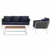 Gather family and friends for pleasant weather and good conversation with the Stance Outdoor Collection. Boasting a contemporary modern look, Stance features woven polyester fabric rope seat back and flared powder-coated aluminum frame, slatted synthetic wood Table tops, and waterproof all-weather fabric cushions with plush 5" thick, dense foam padding provide a relaxing spot to lounge. A versatile set designed for long-lasting durability, each piece in the Stance Collection can be mixed and matched and effortlessly arranged to fit the spontaneous needs of you and your guests. Cushion Thickness: 5"H. Chair Weight Capacity: 331 lbs. / Sofa Weight Capacity: 551 lbs.