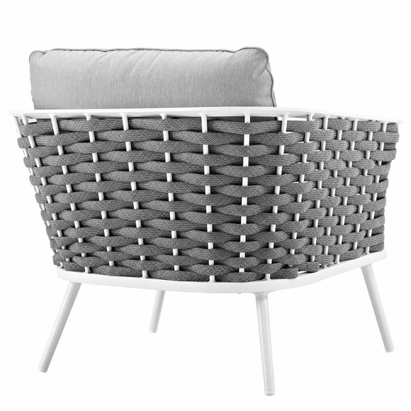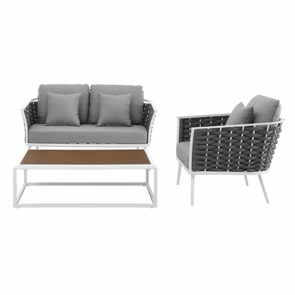Gather family and friends for pleasant weather and good conversation with the Stance Outdoor Collection. Boasting a contemporary modern look, Stance features woven polyester fabric rope seat back and flared powder-coated aluminum frame, slatted synthetic wood Table tops, and waterproof all-weather fabric cushions with plush 5" thick, dense foam padding provide a relaxing spot to lounge. A versatile set designed for long-lasting durability, each piece in the Stance Collection can be mixed and matched and effortlessly arranged to fit the spontaneous needs of you and your guests. Cushion Thickness: 5"H. Chair Weight Capacity: 331 lbs. / Sofa Weight Capacity: 551 lbs.