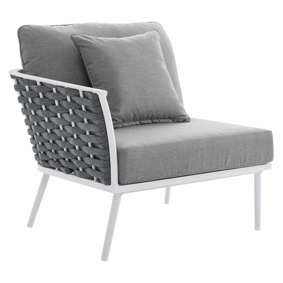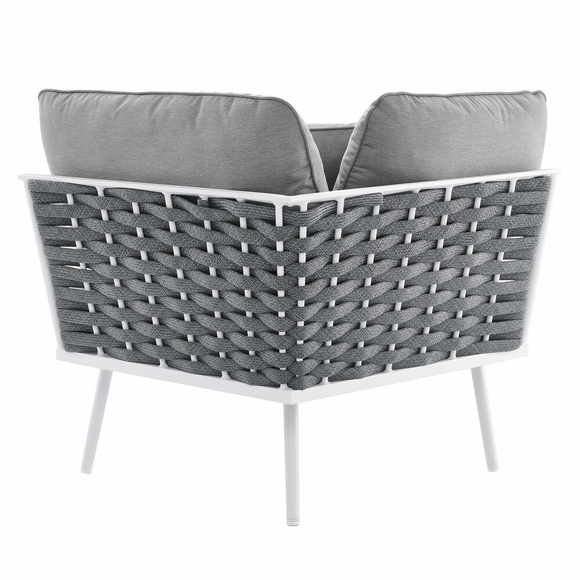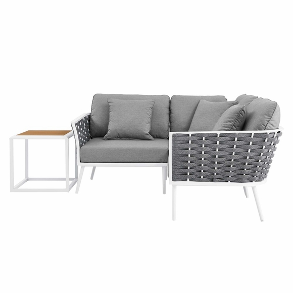 Gather family and friends for pleasant weather and good conversation with the Stance Outdoor Patio Furniture Collection. Boasting a contemporary modern look, the 4-Piece Outdoor Patio Sectional Sofa Set features woven polyester fabric rope seat backs and flared powder-coated aluminum frames, slatted synthetic wood Table tops, and water resistant all-weather fabric cushions with plush 5" thick, dense foam padding provide a relaxing spot to lounge. A versatile set designed for long-lasting durability, each piece in the Stance Collection can be mixed and matched and effortlessly arranged to fit the spontaneous needs of you and your guests. Stance includes non-marking, height-adjustable foot caps. Assembly Required. Set Includes: 1 Left-Arm Chair, 1 Right-Arm Chair, 1 Corner Chair, 1 Side Table