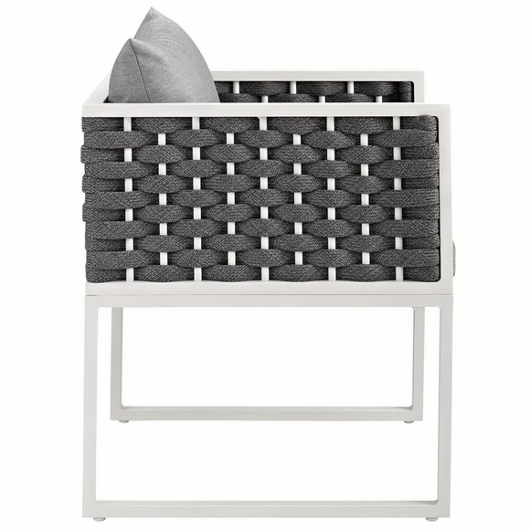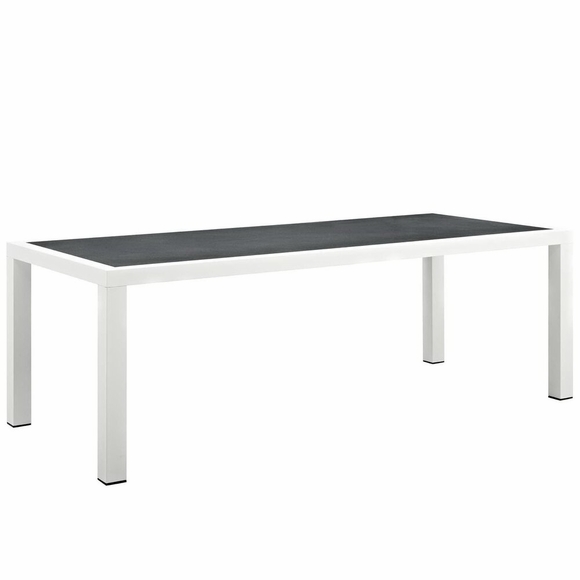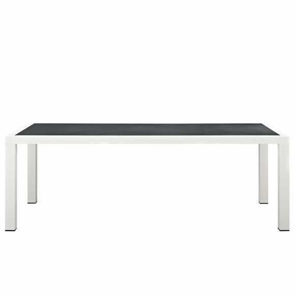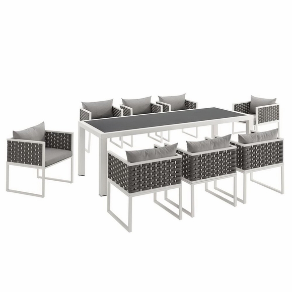 Gather family and friends for pleasant weather and good conversation with the Stance Outdoor Collection for an exceptional al fresco dining experience. Boasting a contemporary modern look, Stance features woven polyester fabric rope seat back and flared powder-coated aluminum frame, waterproof all-weather fabric cushions, and a 90.5" rectangle table with a spray stone glass surface for all your entertaining and casual dining needs. A versatile set designed for long-lasting durability, the Stance Collection can be mixed and matched and effortlessly arranged to fit the spontaneous needs of you and your guests. Chair Weight Capacity: 331 lbs.