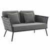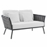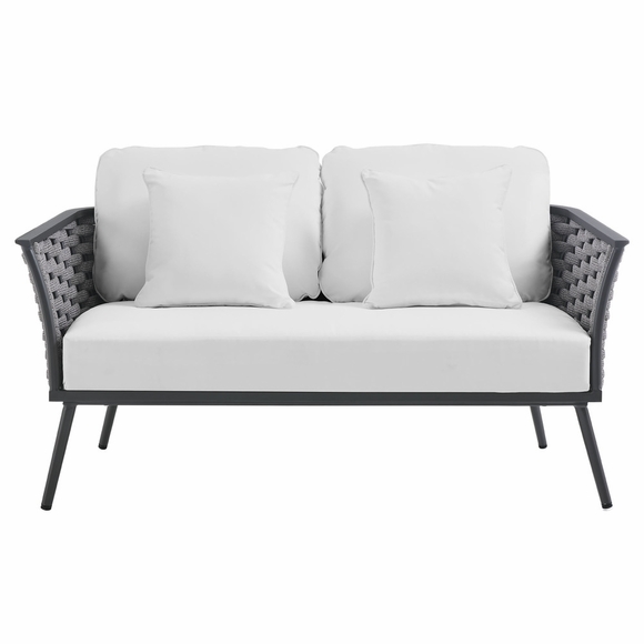 Gather family and friends for pleasant weather and good conversation with the Stance Outdoor Collection. Boasting a contemporary modern look, Stance features woven polyester fabric rope seat back and flared powder-coated aluminum frame, while waterproof all-weather fabric cushions with dense foam padding provide a relaxing spot to lounge. A versatile set designed for long-lasting durability, each piece in the Stance Collection can be mixed and matched and effortlessly arranged to fit the spontaneous needs of you and your guests. Loveseat Weight Capacity: 440 lbs.