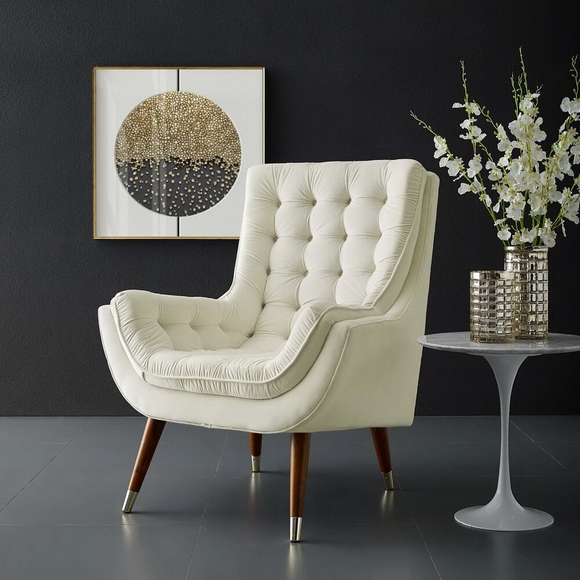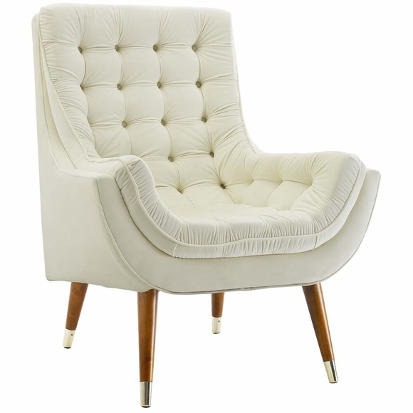 Upgrade your leisure time with the elegance and luxury of Suggest Performance Velvet Lounge Chair. Upholstered in stain-resistant performance velvet, Suggest delivers sophistication with deep button-tufting, flared armrests, and splayed wood legs with gold metal sleeves. The rich texture of this armchair is soft to the touch, while plush dense foam cushion padding, a deep seat pocket, non-marking foot caps, and gentle recline, provide unparalleled support while reading, resting, relaxing, or conversing. A chic mid-century inspired accent or lounge chair for the living room, bedroom or reading nook, Suggest makes a supremely comfortable addition to the modern home. Chair Weight Capacity: 331 lbs.