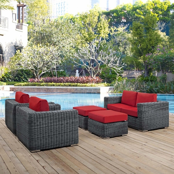 Set Includes: Two - Summon Rattan Outdoor Patio ArmchairsOne - Summon Rattan Outdoor Patio LoveseatTwo - Summon Rattan Outdoor Patio Ottomans