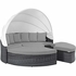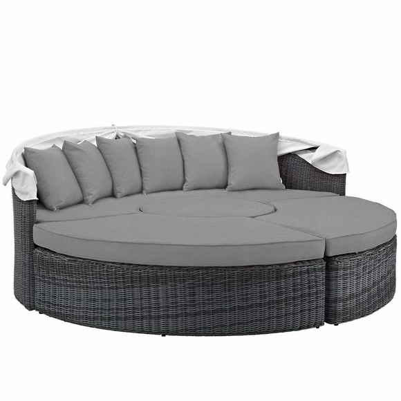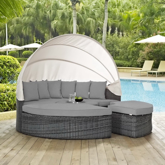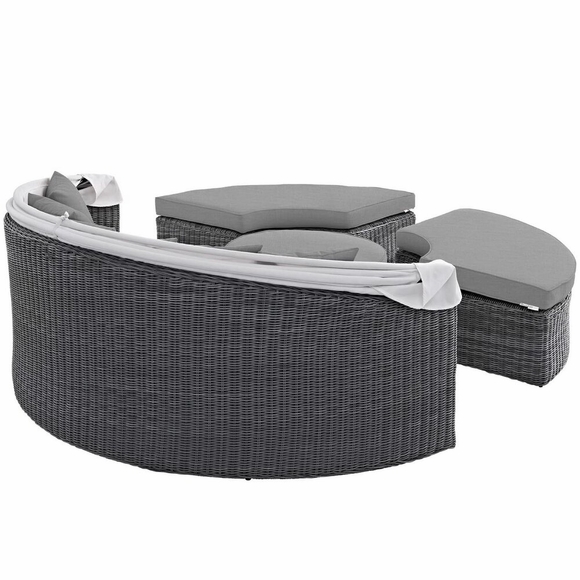 Experience the outdoors with exceptional comfort and quality. Summon Outdoor Patio Sectional Daybed offers an exquisite two-tone synthetic rattan weave, plush all-weather cushions with industry-leading Sunbrella® fabric, UV protection, and a sturdy powder-coated aluminum frame. Featuring rounded shape and an elegant modern look, Summon Outdoor Sectional Daybed is an avant-garde outdoor sectional series well-equipped for enhancing patio, backyard, or poolside gatherings. This installment of the series is an outdoor patio daybed with retractable canopy.