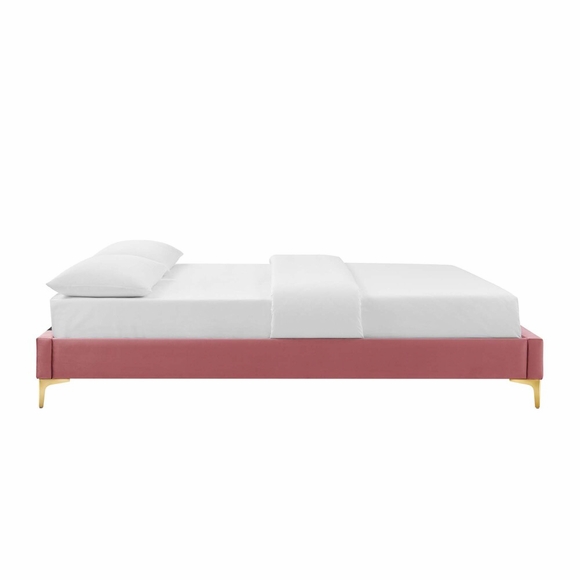 Awaken a master bedroom or guest bedroom with the energizing style of the Sunny Performance Velvet King Bed. Offering luxe texture and a glam deco look, the queen headboard of this bed features an arching silhouette reminiscent of the morning sunrise. This queen size bed is upholstered in stain-resistant performance velvet and padded with dense foam creating a soft, supportive place to rest and relax while sitting up in bed. Eliminating the need for a box spring, the MDF frame of this queen bed is complete with a wood slat support system crafted with poplar for lasting durability and support. A sturdy mattress foundation for memory foam, innerspring, latex, and hybrid mattresses, this slatted bed frame rests on gold metal legs with non-marking foot caps and includes a reinforced center beam with two support legs for enhanced stability. King Bed Weight Capacity: 800 lbs.