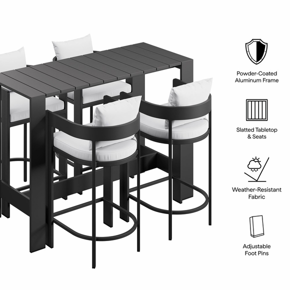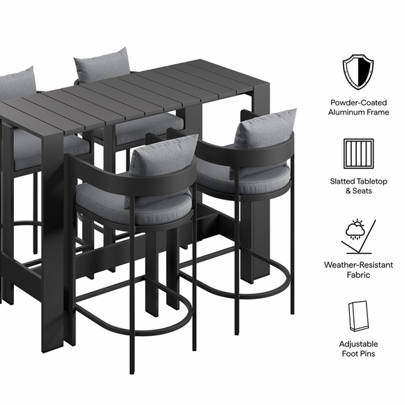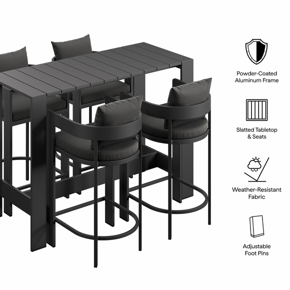 Enliven your alfresco spaces with the Tahoe Outdoor Patio 5-piece Bar Set. Built with durable aluminum frames and finished in a smooth powder-coated finish, this bar table and chairs set brings a clean, modern look to outdoor spaces. The set includes one rectangular bar-height table and four matching bar chairs for drinks, casual meals, and easy conversation. Featuring a slatted tabletop with smooth edges and coordinating slatted chair seats, Tahoe wipes down easily and stays simple to maintain. With easy assembly and adjustable plastic foot pins to help keep it level on uneven surfaces, this patio bar set is made for everyday outdoor dining and gatherings. Table Weight Capacity: 221 lbs. Chair Weight Capacity: 300 lbs. Each.