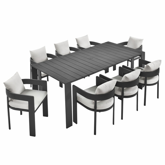 Enliven your alfresco spaces with the Tahoe Aluminum Outdoor Dining Set for 8. This modern 9 piece patio dining set includes a large rectangular dining table and eight chairs, all constructed with well-crafted, durable powder-coated aluminum, dispensing contemporary elegance in your outdoor dining spaces. Each Tahoe Aluminum Patio Chair features an open curved back and is designed with removable, stain-resistant cushions filled with dense foam padding and covered in sunproof, water-resistant fabric. The matching 83-inch patio table complements the chairs with its low-maintenance design, slatted top, and practical umbrella hole with a fitted lid, perfect for year-round functionality. The outdoor dining set for 8 features a table with easy-to-follow assembly instructions and pre-assembled chairs, all equipped with non-marking foot glides to safeguard your deck or patio floor. Weight Capacity - Chair: 300 lbs, Dining Table: 220.5 lbs.