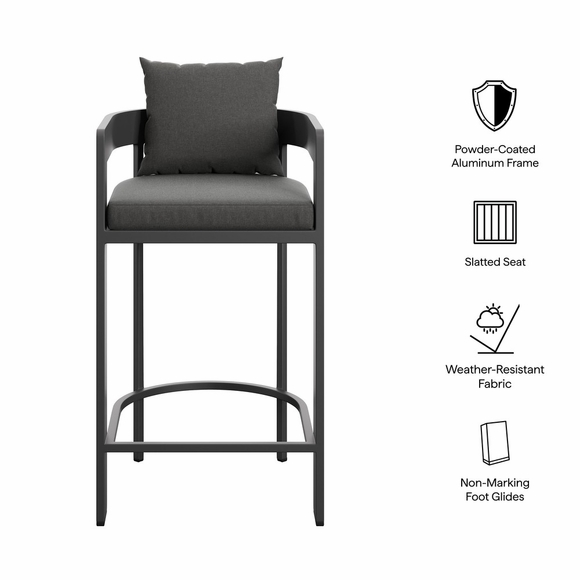 Enliven your alfresco spaces with the Tahoe Aluminum Outdoor Patio Bar Height Chair. This bar-height outdoor chair is made from powder-coated aluminum with a clean, modern profile for patios, decks, and backyard entertaining. Featuring a curved back, a slatted seat, and a wraparound stretcher for foot support, Tahoe also comes with removable seat and back cushions filled with dense foam and covered in sunproof, water-resistant fabric. Whether paired with a Tahoe bar table or mixed with other outdoor high top tables, this barrel bar stool offers a comfortable place to enjoy morning coffee, casual meals, or evening drinks. Equipped with non-marking foot glides to help protect patio and deck flooring, Tahoe comes fully assembled. Weight Capacity: 300 lbs.