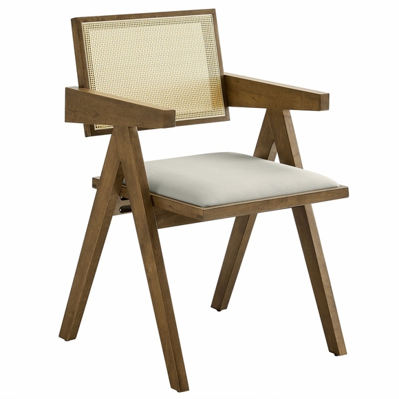 Update your dining decor with the modern allure of the Thera Set of 2 Rattan Dining Chairs. Crafted with a durable rubberwood frame, these wood dining chairs seamlessly blend retro design with modern aesthetics, making them a stylish choice as dining table chairs or kitchen table chairs. Featuring vegan leather seats and breathable rattan cane backs, the Thera mid-century modern dining chairs provide an inviting mix of textures and materials. The arms on each rattan chair are wider at the back and taper toward the front, creating a dynamic, angled design that enhances both the visual appeal and the ergonomic comfort of the chair. The legs are designed with a striking A-frame design, splaying outward for added stability and contributing to the contemporary dining chairs' geometric aesthetic. Whether placed around a dining table or used as faux leather accent chairs in the living room, the Thera cane dining chairs bring modern flair to any setting. Assembly required. Weight Capacity: 507 lbs.