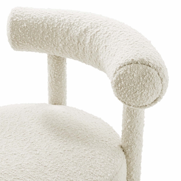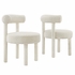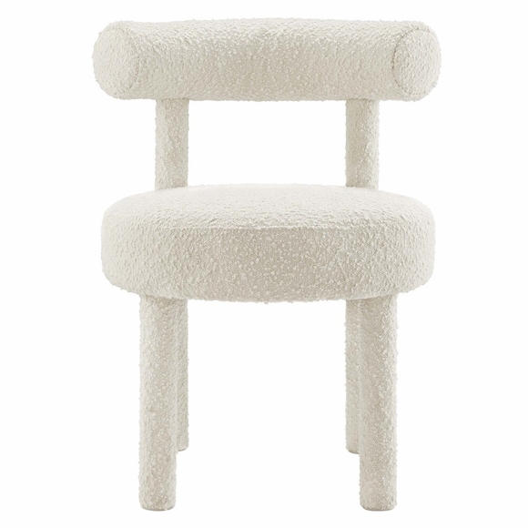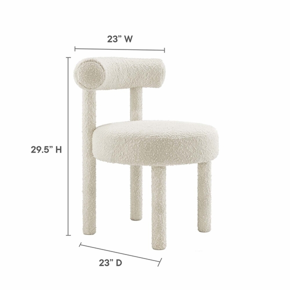 Enhance your space with the exquisite Toulouse Boucle Upholstered Dining Chair Set of 2. This unique set combines dining chair functionality with accent chair elegance. Upholstered in beautifully textured boucle fabric, these dining chairs exude modern luxury and glam deco style. The curved bolster pillow backrests, circular seats, and dense foam padding provide unparalleled comfort and unmatched aesthetics. With non-marking foot pads to protect your flooring, these boucle dining chairs add a touch of sophistication to any room. Weight Limit: 330 lbs.