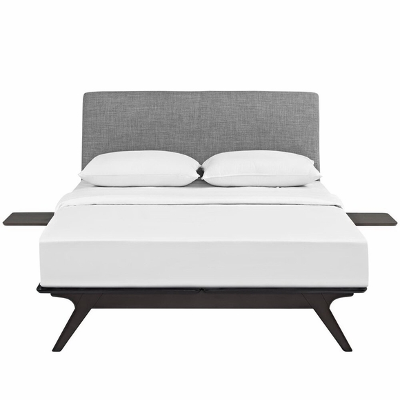 Transform your ordinary bedroom arrangements into a more compelling decor with the Tracy bedroom set. The Tracy bed, with its open design and platform leg support, proves that elegance doesn't need to come at the expense of simplicity. Finely upholstered with a foam padded fabric headboard, Tracy is an easy to maintain toffee brown stained piece that admirably delivers both comfort and style. Tracy requires assembly and should be spot cleaned only. Headboard included. Queen size mattress not included. The Tracy queen size platform bed does not need a box spring.