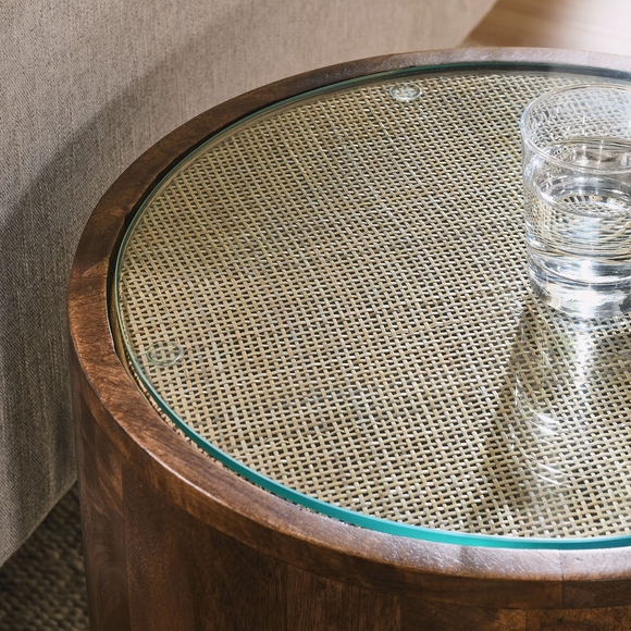 The Truett Round Wood Side Table highlights the beauty of natural wood in a rustic, laid-back design. Crafted from solid wood with a rich mango wood veneer, its cylindrical drum table shape features a rattan cane top beneath a tempered glass overlay, bringing both texture and durability to the design. Its versatile use makes it the perfect small accent table for compact spaces, whether as a plant stand in the hallway or as a round side table in the living room. Designed with non-marking foot pads, the Truett Rattan Cane End Table ensures your floors stay protected while effortlessly adding a natural touch to any room. Arriving fully assembled for immediate use, this wood glass top side table adds both style and practicality to your home. Weight Capacity: 50 lbs.