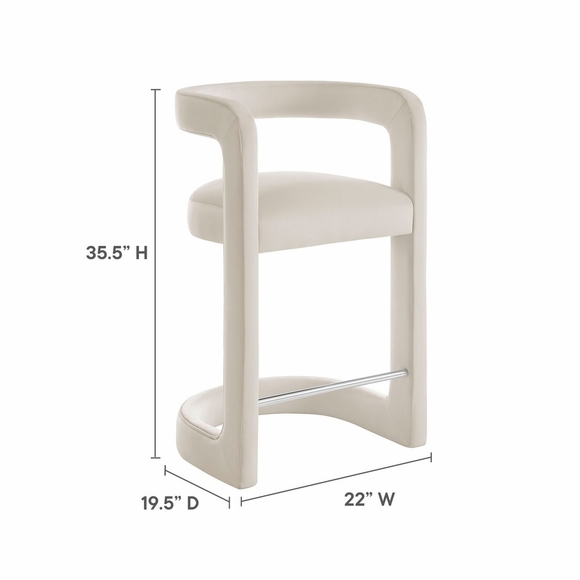 Lift the ambiance of your kitchen island or dining area with the Winslow Performance Velvet Counter Stool. Featuring a distinctive curved frame and supportive open backrest, this 35-inch counter stool adds an elevated touch of style to any space. Upholstered in soft performance velvet and padded with dense foam for a comfortable seating experience, this counter-height stool also includes a stainless steel footrest, offering a practical and stylish support feature. The open backrest transitions into smooth, continuous armrests that flow down to meet the elegantly curved legs, which mirror the backrest's shape. This harmonious silhouette enhances the modern aesthetic, while non-marking foot caps protect your flooring. Whether used as a velvet stool for your kitchen counter or a chic seating option for the dining area, the Winslow Counter Stool brings luxurious comfort and modern elegance to your home. Weight Capacity: 330 lbs.