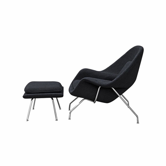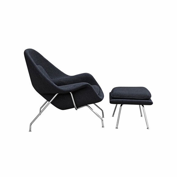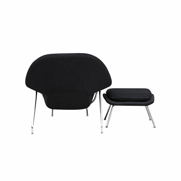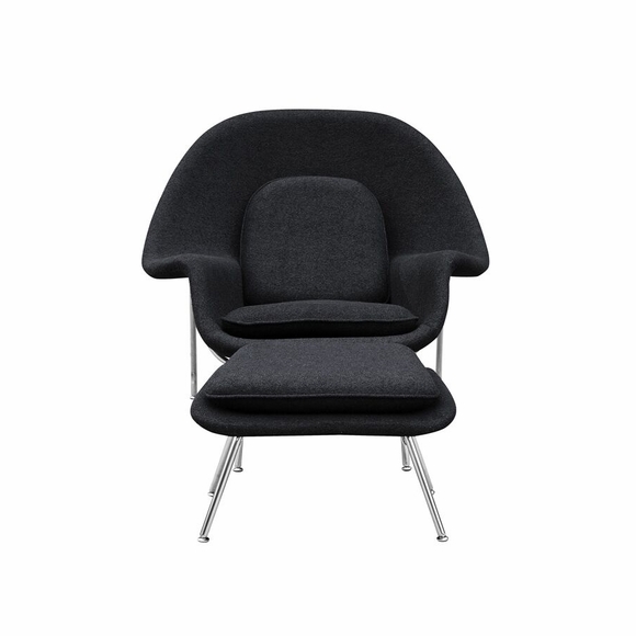 The Woom Chair and Ottoman originally designed by Eero Saarinen in 1948 is an Iconic Piece that continues to be one of the most recognized representations of Mid-Century modernism. Our Reproduction of the Woom Chair and Ottoman is made from Premium Wool Fabric, and meets the architectural specifications of the original. It was named the Woom Chair because it envelops, allowing you to curl up and relax in comfort. This high quality reproduction of the Woom Chair and Ottoman features Stainless Steel Frame and Fiberglass Shell Upholstered.