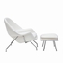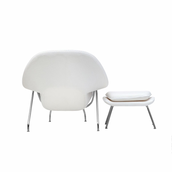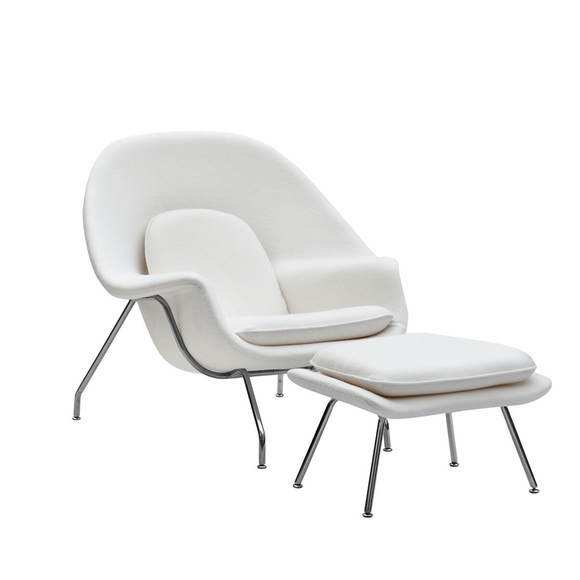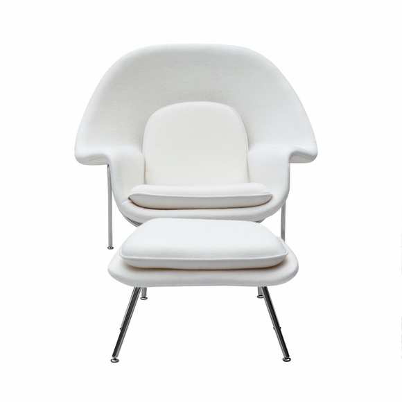 The Woom Chair and Ottoman originally designed by Eero Saarinen in 1948 is an Iconic Piece that continues to be one of the most recognized representations of Mid-Century modernism. Our Reproduction of the Woom Chair and Ottoman is made from Premium Wool Fabric, and meets the architectural specifications of the original. It was named the Woom Chair because it envelops, allowing you to curl up and relax in comfort. This high quality reproduction of the Woom Chair and Ottoman features Stainless Steel Frame and Fiberglass Shell Upholstered.