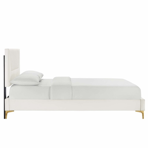 Introduce a polished aesthetic in your master bedroom or a guest room with the sleek and elegant Yasmine Channel Tufted Performance Velvet King Platform Bed. The king-sized upholstered bed brings contemporary refinement with subtle glam deco style into mid-century modern or eclectic settings, featuring vertical channel tufting set within soft angular lines. Tailored in stain-resistant performance velvet, the durable MDF bed frame provides a sturdy foundation for memory foam, innerspring, latex, and hybrid mattresses. The well-crafted poplar wood slat support system features a reinforced center beam and two support legs, granting endless support and eliminating the need for a box spring. The slatted king bed frame rests on gold metal legs with non-marking foot caps. Assembly required. Weight Capacity: 800 lbs.