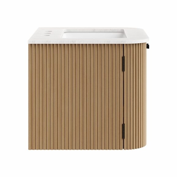 Give your bathroom a modern upgrade with the Zia 24" Wall Mount Vanity. Its floating, wall-mounted design opens up the space, creating a light and airy feel. The solid wood base features a textured fluted pattern, with deep vertical grooves that add both visual interest and a touch of depth. The marble sink top, complete with a curved basin and three 8" widespread faucet holes, gives you plenty of options for a faucet that suits your style. Inside, two soft-close hinged doors reveal adjustable shelves for convenient storage, and cutouts for plumbing ensure a seamless installation. The Zia Modern Bathroom Vanity with Sink effortlessly blends modern design with everyday function, bringing timeless beauty and chic practicality to your bathroom. Assembly is required and fixtures are not included. Weight Capacity: 132 lbs.
